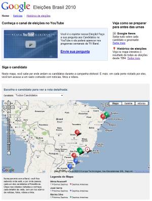 Pelo Google Maps você pode acompanhar os candidatos por todo o Brasil, Com atualizações diárias, é possível saber exatamente onde e o que o político está fazendo. Houve também um cruzamento de informações do Google Insights for Search com o Google News. Por isso agora é possível acompanhar as tendências de busca sobre um determinado candidato ou assunto e saber quais notícias foram publicadas durante o mesmo período"Nosso pacote de ferramentas para as eleições 2010 vai ajudar os usuários a seguir de perto seus candidatos e os principais assuntos das campanhas, estimulando uma interação democrática diversa e aberta de todos os brasileiros com seus representantes eleitorais", diz Alexandre Hohagen, diretor geral do Google para América Latina.